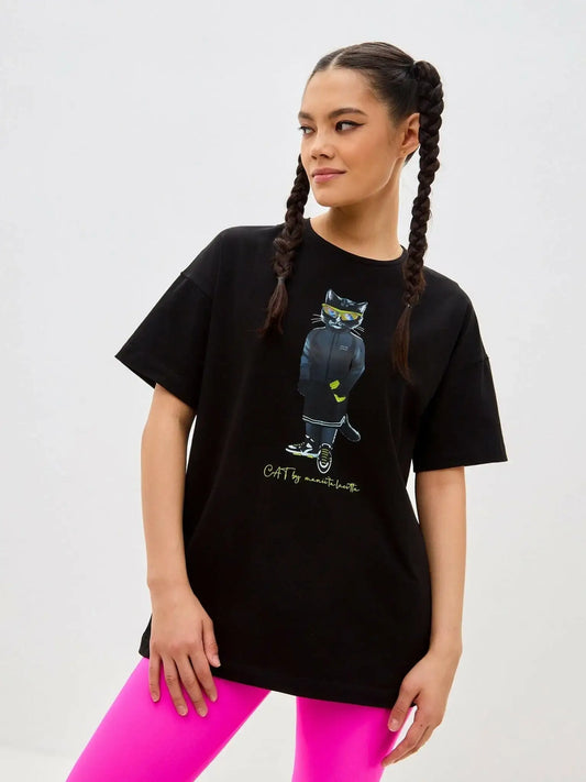 Sport set: black short oversized t-shirt sport cat and black women's sport shorts