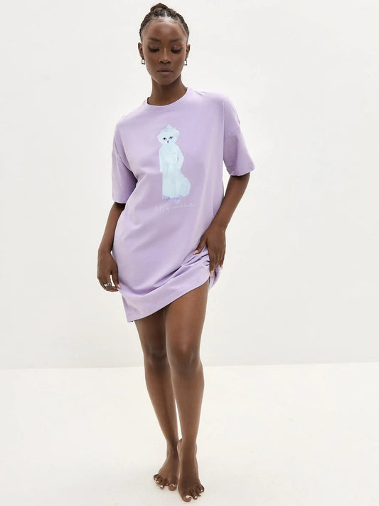 Sport set: violet women's sport shorts and short t-shirt with cat
